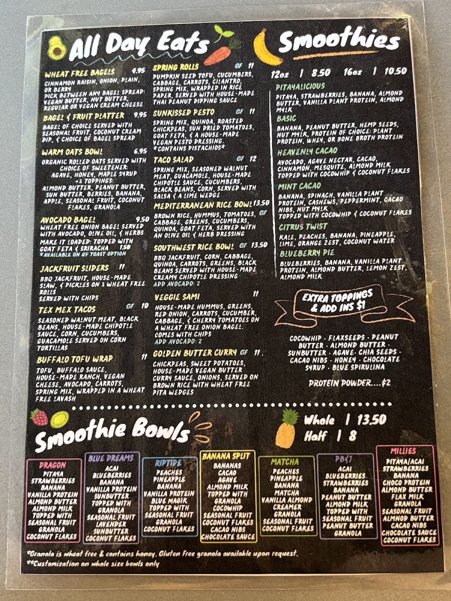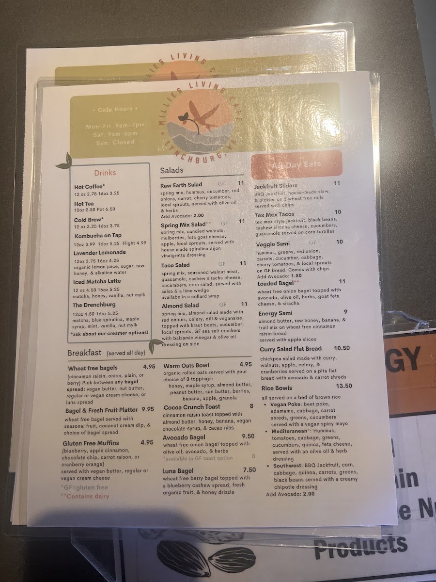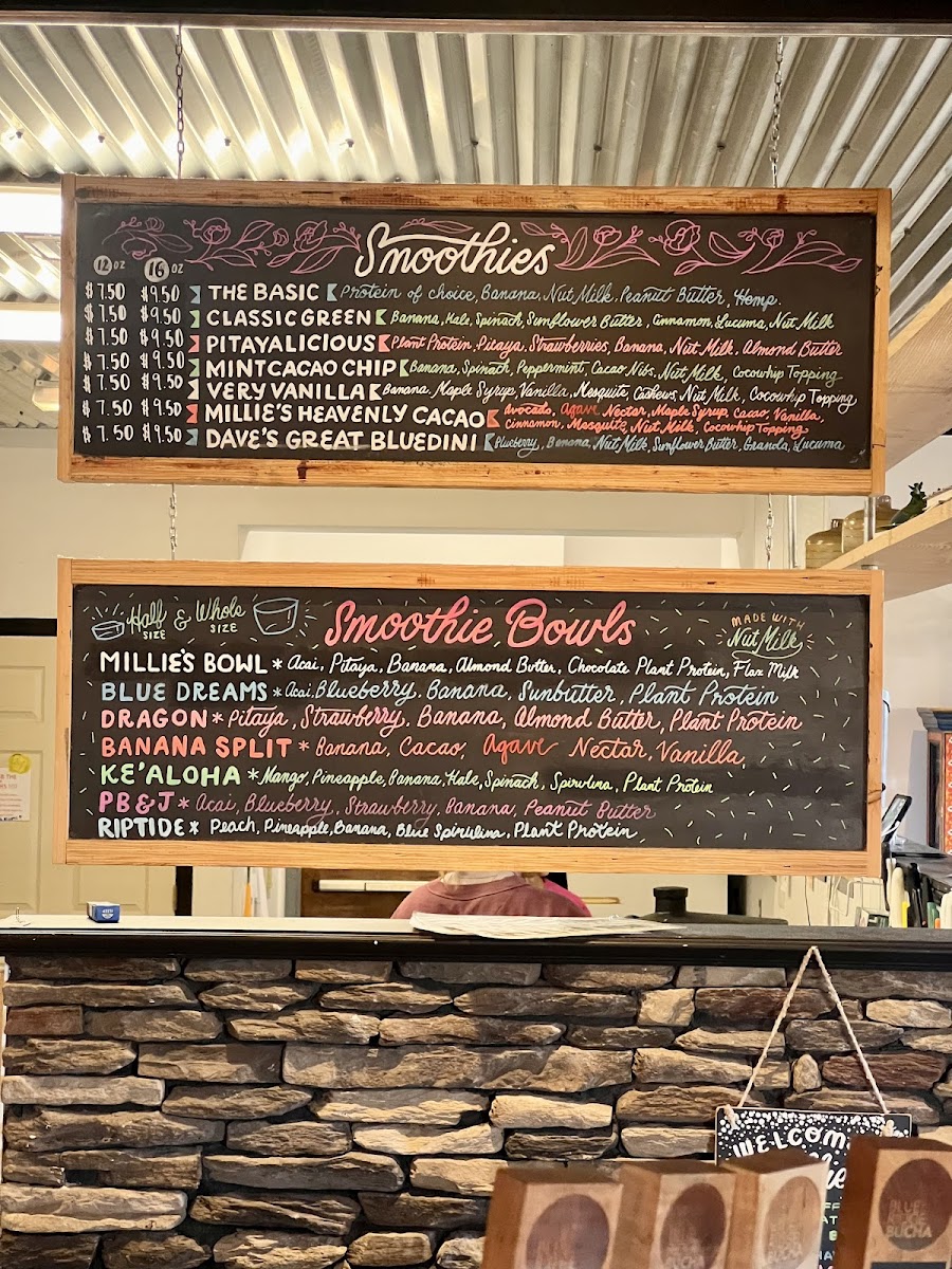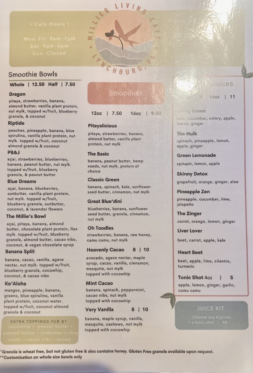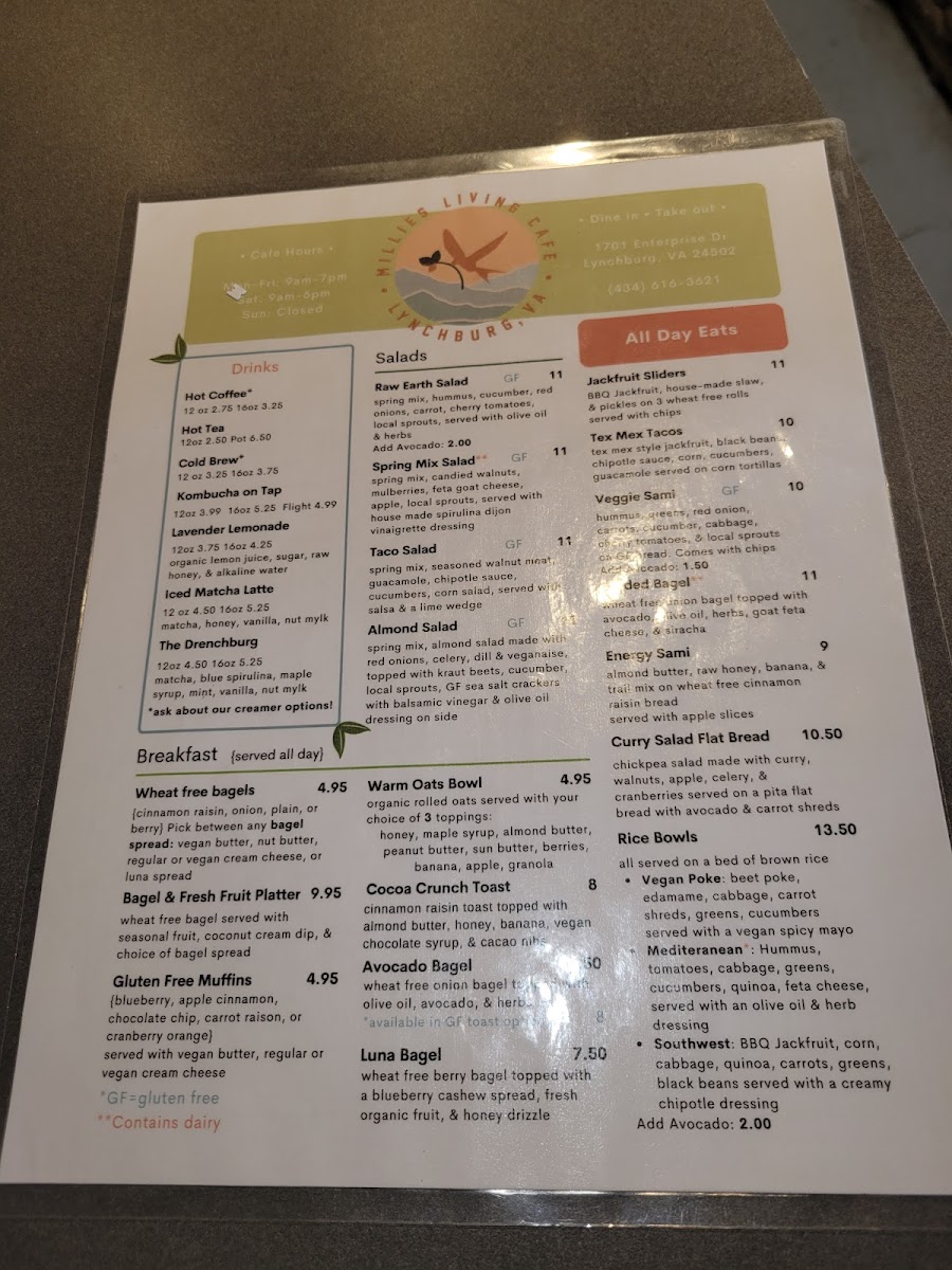 From a reviewer’s perspective, the menu at Millie’s Living Café offers a well-curated snapshot of its plant-forward, wellness-focused philosophy, bringing together freshness, creativity, and balance. The drink selection immediately stands out, especially the fresh juices like Pineapple Zen, The Zinger, Liver Lover, Heart Beet, and the concentrated Tonic Shot 4oz, each crafted to highlight natural flavors and functional benefits. Smoothie lovers are equally well served with options such as Heavenly Cacao, Citrus Twist, Pitayalicious, Mint Cacao, and the nostalgic yet nourishing PB&J Smoothie. For those seeking comforting or energizing beverages, the café rounds things out with Cold Brew, Chai Latte, Kombucha On Tap, Blushing Beet, and the subtly sweet Honey Pot Latte. The all-day food offerings bring substance to the menu, with satisfying choices like Spring Rolls, Southwest Rice Bowl, Taco Salad, Bagel And Fresh Fruit Platter, and Wheat Free Bagels, making it easy to find something light or filling at any time of day. Finally, the smoothie bowls add a visually appealing and hearty finish, ranging from The Millie’s Bowl (Whole) to Blue Dreams (Half), Matcha Bowl (Half), Blue Dream (Whole), and Gingerbread (Half). Altogether, the menu feels thoughtfully designed, offering variety without being overwhelming, and leaves a clear impression of a café committed to wholesome ingredients, mindful preparation, and an inviting, health-conscious dining experience.